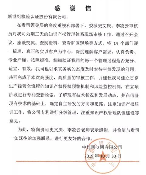 四O四對(duì)認(rèn)證審核工作高度重視、積極配合,順利通過知識(shí)產(chǎn)權(quán)管理體系的認(rèn)證審核,證書認(rèn)證范圍是:與核燃料的加工,核設(shè)施退役相關(guān)的知識(shí)產(chǎn)權(quán)管理。在征得公司同意之后,BCC將四O四作為優(yōu)秀貫標(biāo)案例向國(guó)家知識(shí)產(chǎn)權(quán)局進(jìn)行了推薦。