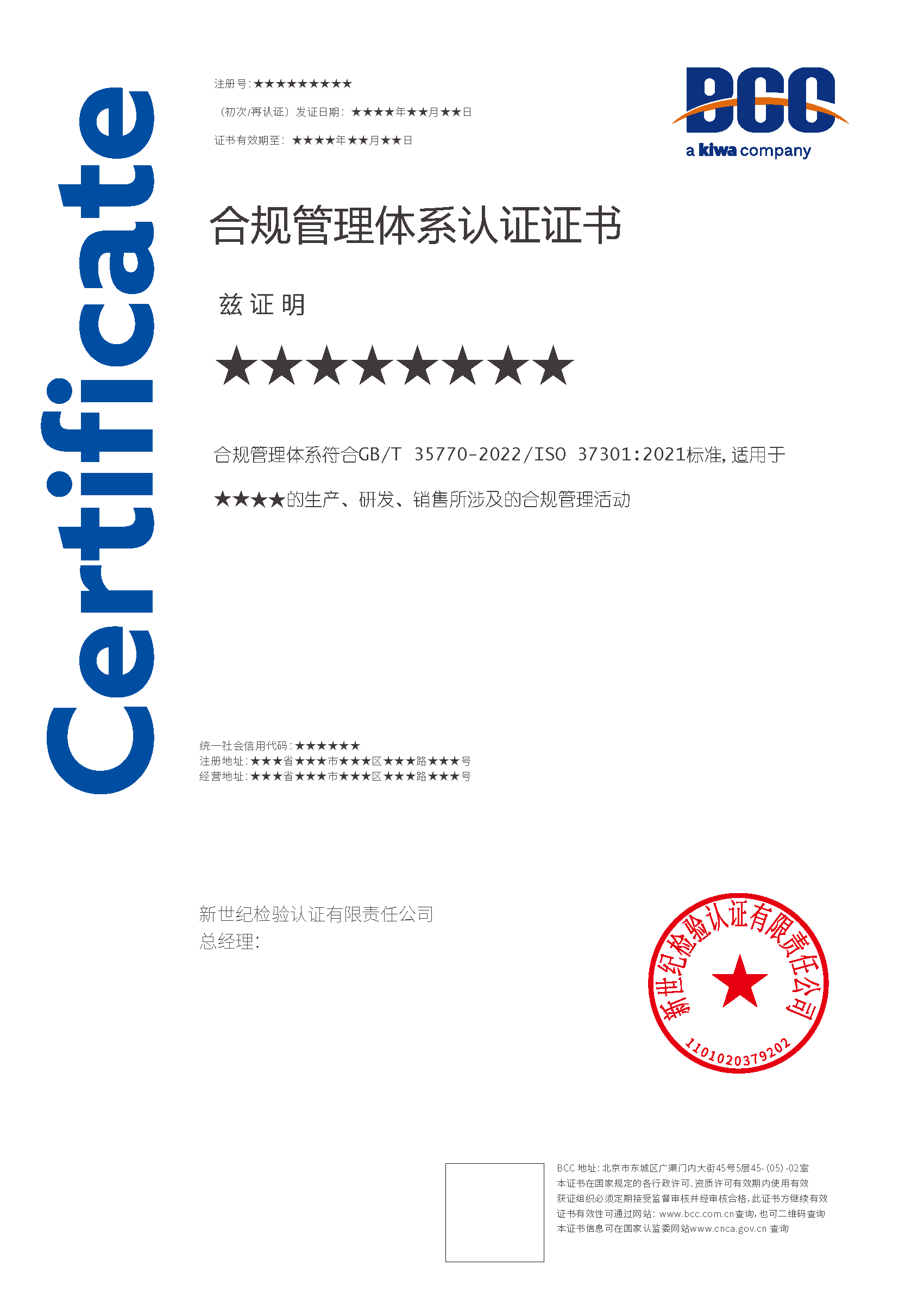 依據(jù)以下標準頒發(fā)合規(guī)管理體系(CMS)認證證書: