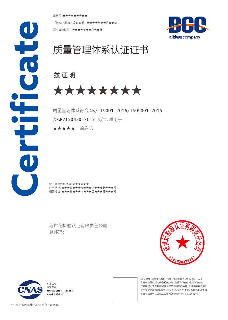 工程建設(shè)施工企業(yè)質(zhì)量管理體系認(rèn)證適用于建設(shè)施工單位(住建部頒發(fā)資質(zhì)的施工企業(yè)),既可以用于施工總承包的單位,如:建筑工程、市政公用工程、電力工程、公路工程、鐵路工程、機(jī)電工程等;此外,還可用于專業(yè)承包的單位,如:防水防腐保溫工程、建筑裝修裝飾工程、消防設(shè)施工程、建筑幕墻工程、電子與智能化工程、建筑機(jī)電安裝工程、環(huán)保工程、鋼結(jié)構(gòu)工程等。