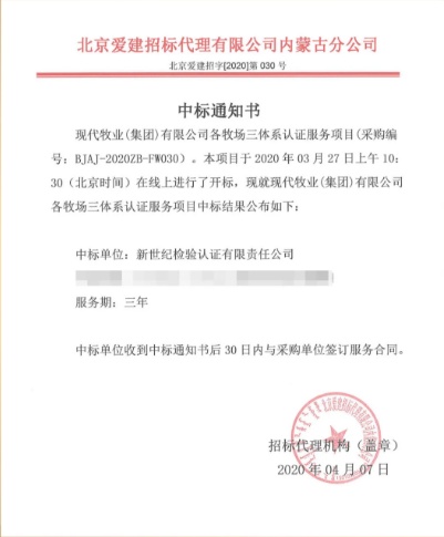 近日,新世紀檢驗認證有限責任公司(簡稱 BCC)收到來自現代牧業(yè)(集團)有限公司的中標通知,成為該公司總部及14家牧場質量、環(huán)境、職業(yè)健康安全管理體系認證項目的服務提供商。