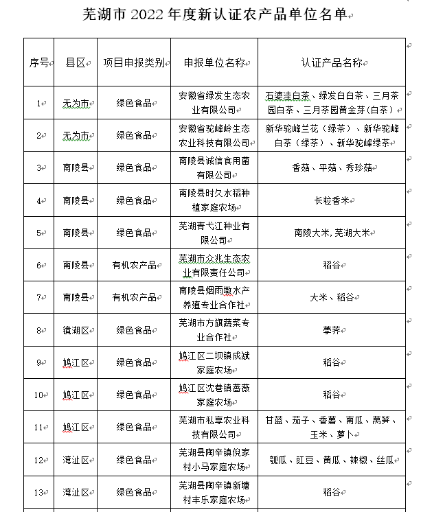 根據(jù)《蕪湖市農(nóng)業(yè)農(nóng)村局 蕪湖市財(cái)政局關(guān)于做好2022年省財(cái)政農(nóng)業(yè)高質(zhì)量發(fā)展(“兩強(qiáng)一增”行動)項(xiàng)目實(shí)施工作的通知》(市農(nóng)計(jì)財(cái)〔2022〕60號)要求,經(jīng)縣(市)區(qū)農(nóng)業(yè)農(nóng)村部門申報(bào),市農(nóng)業(yè)農(nóng)村局審核,擬對蕪湖市2022年度新認(rèn)證綠色食品、有機(jī)農(nóng)產(chǎn)品、地理標(biāo)志農(nóng)產(chǎn)品的29家單位進(jìn)行公示。如下圖: