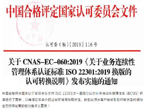 2019年12月31日,中國(guó)合格評(píng)定國(guó)家認(rèn)可委員會(huì)(CNAS)發(fā)布了關(guān)于CNAS-EC-060:2019《關(guān)于業(yè)務(wù)連續(xù)性管理體系認(rèn)證標(biāo)準(zhǔn)ISO22301:2019換版的認(rèn)可轉(zhuǎn)換說(shuō)明》發(fā)布實(shí)施的通知。