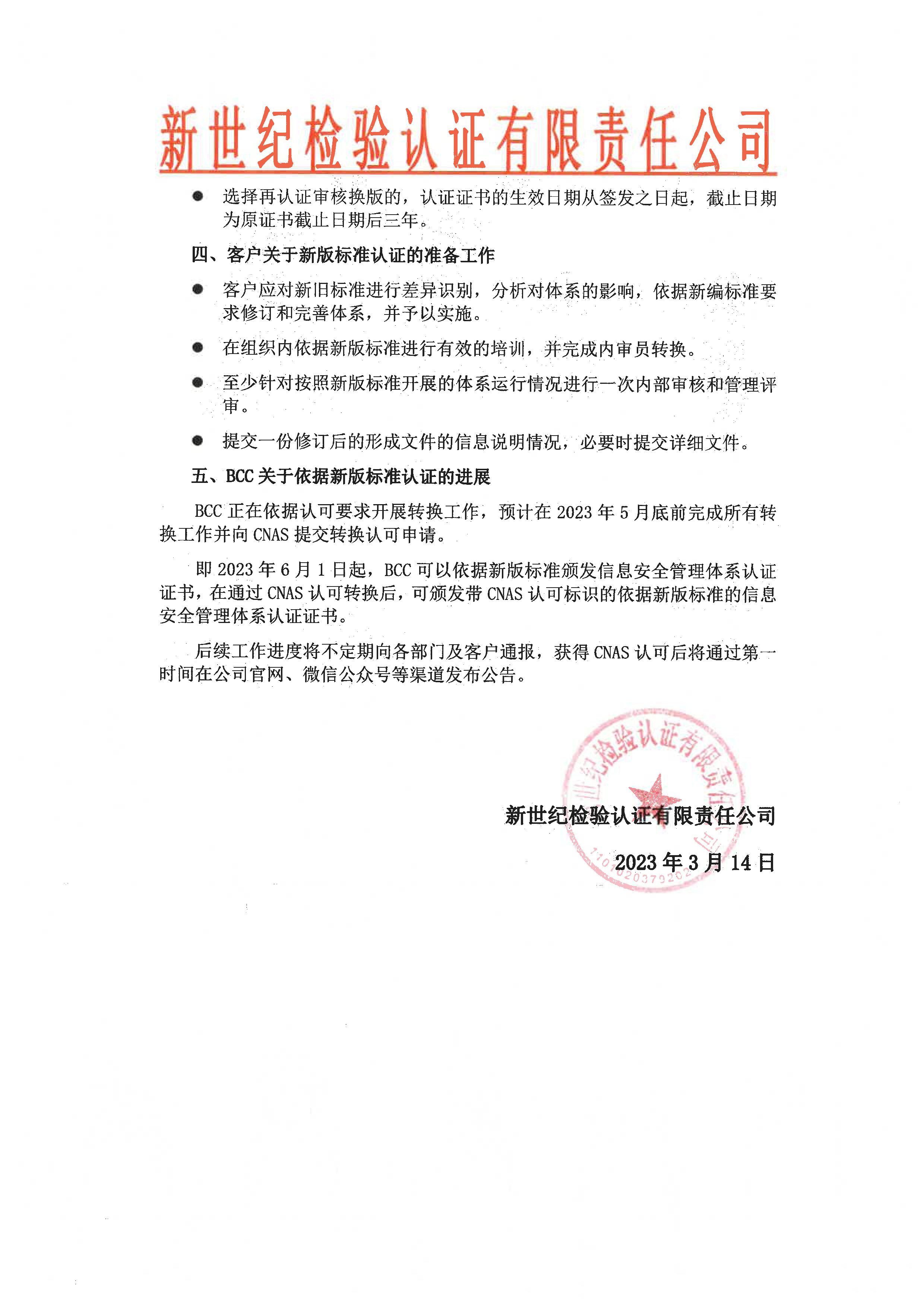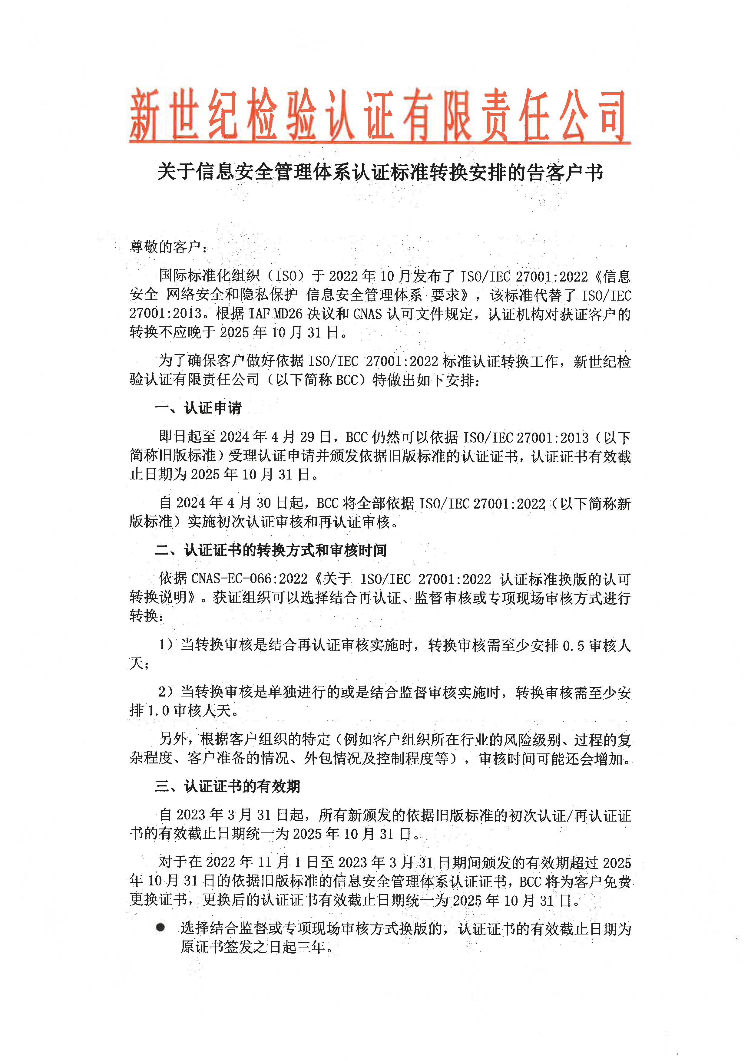 關于信息安全管理體系認證標準轉換安排的告客戶書