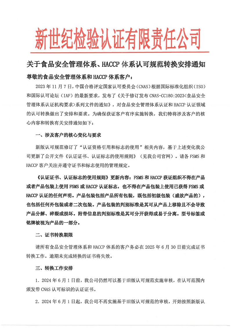 請(qǐng)所有食品安全管理體系和HACCP體系的客戶務(wù)必在2025年6月30日前完成證書轉(zhuǎn)換工作。逾期未完成轉(zhuǎn)換的證書將失效。