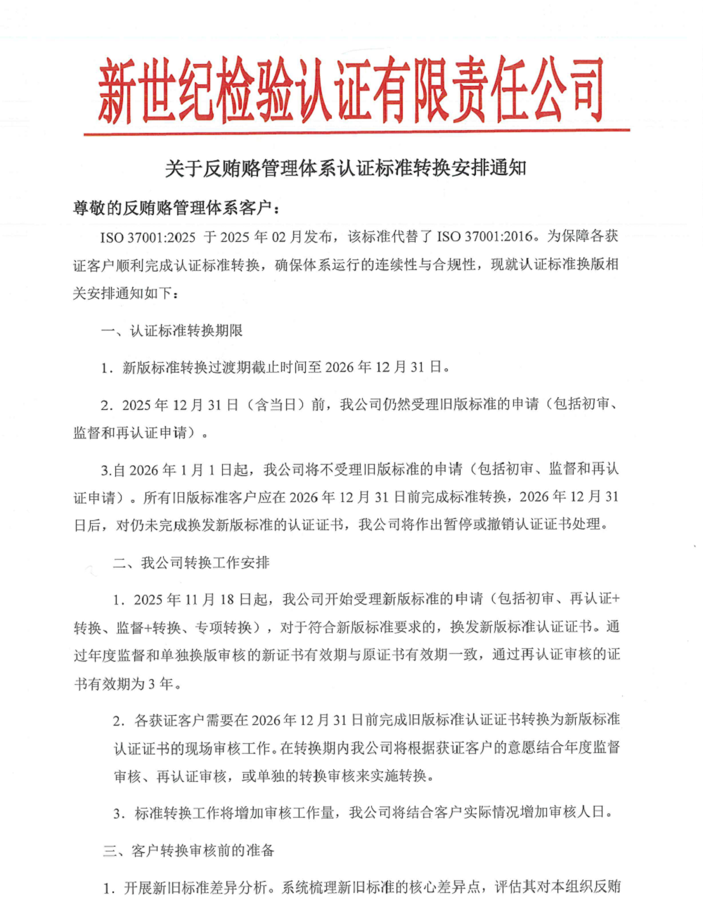 ISO 37001:2025 于2025年02月發(fā)布,該標(biāo)準(zhǔn)代替了ISO 37001:2016。為保障各獲證客戶順利完成認(rèn)證標(biāo)準(zhǔn)轉(zhuǎn)換,確保體系運行的連續(xù)性與合規(guī)性,現(xiàn)就認(rèn)證標(biāo)準(zhǔn)換版相關(guān)安排通知如下: