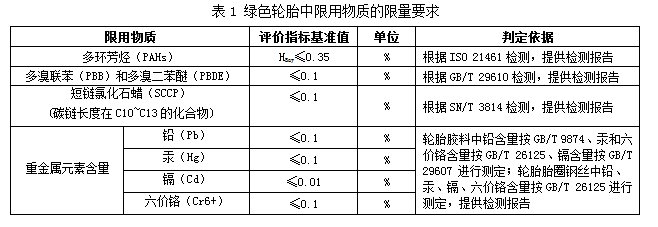 3、環(huán)境屬性。參照已發(fā)布并實(shí)施的《輪胎中限用物質(zhì)的限量要求》國家標(biāo)準(zhǔn),對輪胎胎面、胎側(cè)、胎圈(除鋼絲以外部分)、三角膠、內(nèi)襯層、內(nèi)胎、墊帶、胎圈鋼絲等各部位的多環(huán)芳烴(PAHs)、重金屬(鉛、汞、鎘、六價(jià)鉻)、短鏈氯化石蠟(SCCP)、多溴聯(lián)苯(PBB)和多溴二苯醚(PBDE)等限用物質(zhì)提出了要求,具體評價(jià)指標(biāo)基準(zhǔn)值及判定依據(jù)詳見表1。